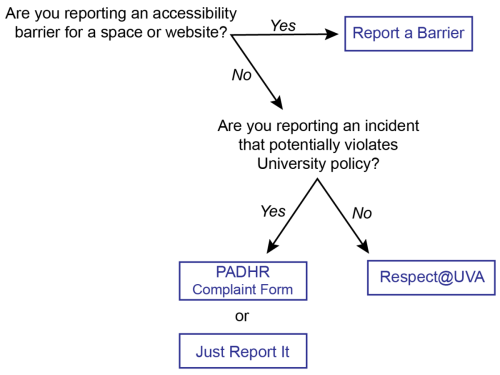 Reporting at UVA is centralized, with the University providing four reporting resources: Just Report it, the Preventing and Addressing Discrimination, Harassment, and Retaliation (PADHR) Complaint Form, Respect@UVA, and Report a Barrier. University employees should familiarize themselves with their mandatory, non-anonymous reporting requirements under Sexual Misconduct Policy and the PADHR Policies. All tools can receive anonymous reports, with the exception of reports pertaining to potential violations of the Sexual Misconduct and PADHR Policies submitted by Responsible Employees (this designation covers all University employees, including faculty, staff, postdoctoral researchers, and graduate and undergraduate research and teaching assistants). These tools are summarized in detail by the Office for Equal Opportunity and Civil Rights (EOCR), and briefly here. For questions regarding which tool to use, see the schematic below. Reports submitted using the wrong tool will be redirected by the receiver, so uncertainty as to which tool to select should not be a barrier to submission.